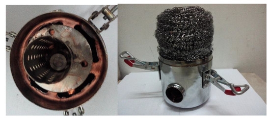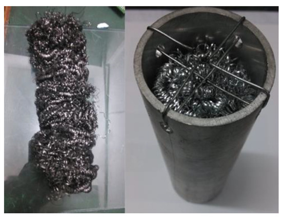 In the experiment, stainless steel fibers were applied as the filter medium, and the cross section of the selected stainless steel fibers was 0.45 mm × 3.56 mm. The volume was 30 mL, as measured by a syringe with a diameter of 36 mm under a pressure of 0.5 MPa, the weight was 19.5 g, the density of the stainless steel fiber reached 7.8 g/cm3, and the porosity was calculated as 91.7%. To ensure the filtration efficiency, in the stainless steel fiber particulate filter, four stainless steel fiber balls were connected in series with iron wires, the series-connected stainless steel fiber balls were contained in a thin-walled aluminum tube, and the stainless steel fiber balls were tightened with iron wires. The stainless steel fiber balls were compressed to the minimum porosity under the tightening force of the iron wires, and the minimum porosity could be maintained to ensure the filtration efficiency. Moreover, the setup could be modularized to facilitate rapid disassembly of the stainless steel fiber particulate filter, as shown in Figure 3.