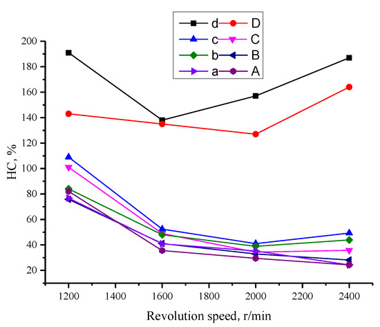 Figure 6 shows the change in HC content at different speeds and loads. When the filter is installed, the HC content in the exhaust gas increases. This occurs as filter installation increases both the back pressure and fuel consumption rate, which in turn leads to an increase in the HC content in the exhaust gas.
