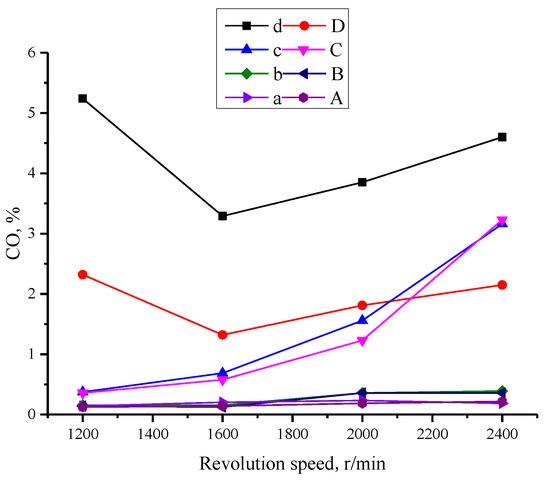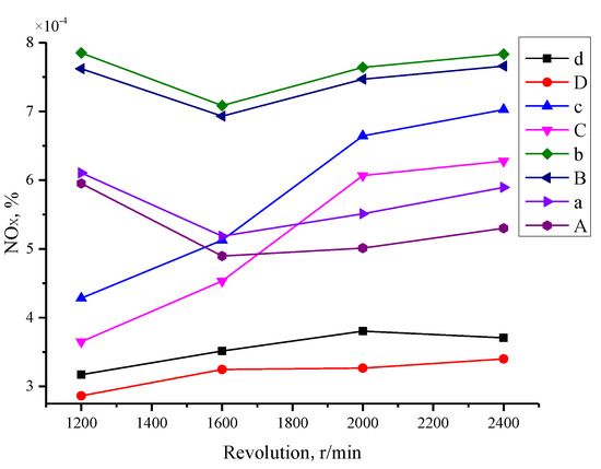 Figure 8 shows the change in the NOx content at different speeds and loads. At a speed of 1200 r/min, the load increases from 25% to 50%, and the generated NOx amount increases. When the load reaches a certain value, the generated NOx amount begins to decrease. Based on the obtained data, the NOx content decreases from the 75% to the 100% load conditions. Under full-load conditions, the minimum NOx content is reached.