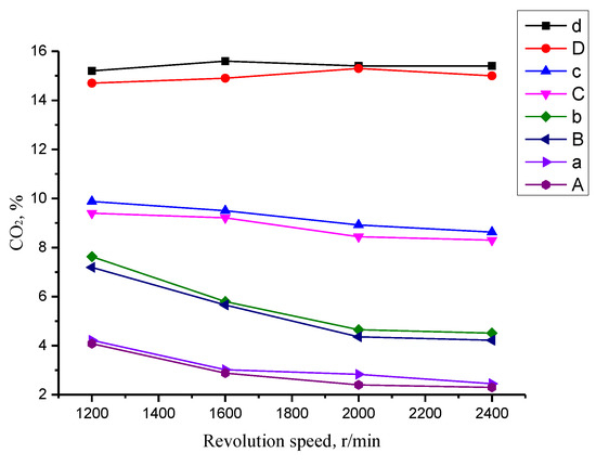 Figure 9 shows the change in the CO2 content at the different speeds and loads. The CO2 generation amount slightly decreases with increasing speed under the load conditions of 25%, 50%, and 75%, and the overall change remains relatively consistent. Under loads of 25%, 50%, and 75%, the CO2 content does not change notably after filter installation, and the CO2 content change after installation under the 100% load does not differ much. This occurs as the CO2 volume fraction has nearly reached its limit value under all operating conditions (the highest CO2 volume fraction measured in the engine test is 17.6%), so the value does not change much.