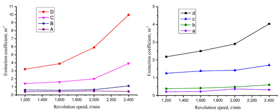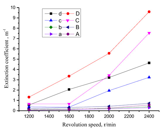 At a rotation speed of 1200 r/min, the extinction coefficient k value is very small. This is attributed to the low rotation speed, long residence time of the emitted PM in the combustion chamber, and sufficient supplementary combustion. Consequently, less PM is emitted. With increasing speed, the emitted PM concentration increases, and the k value correspondingly increases.
