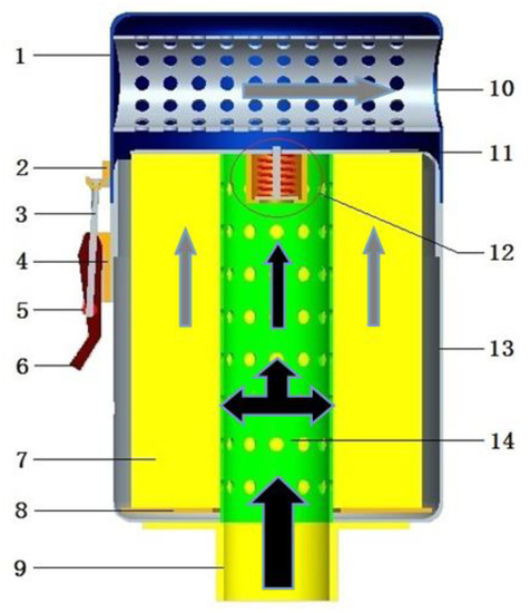 When the optimized muffler is operated for a certain period of time, the PM accumulated in the filter element can seriously hinder the discharge of gas, which can cause a pressure difference between the exhaust pipe and the upper side of support plate 11 (Figure 14). At this time, the pressure difference can overcome the resistance of spring 5, force one-way valve element 4 to open, and make gas flow out of pressure relief hole 3. Untreated exhaust exhibits a strong odor and contains smoke, and a preliminary assessment can be made on whether the filter element should be replaced.