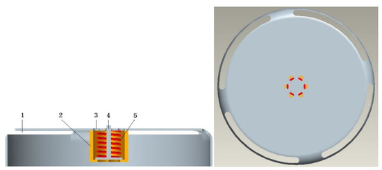 Optimized design of the upper housing. 1. Exhaust hole; 2. pressure valve pipe; 3. pressure relief hole; 4. valve element; 5. spring.
