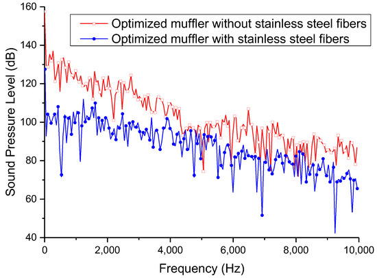 The following simulation results are obtained: before adding the stainless steel fibers, the noise in the optimized muffler is high, especially low-frequency noise, mainly below 5 kHz, and the total sound pressure level reaches approximately 100 dB (as shown in Figure 16). After the installation of stainless steel fiber in the optimized muffler, low-frequency noise is significantly reduced, and the sound power is evenly distributed at each frequency. The total sound pressure level reaches approximately 85 dB (as shown in Figure 16). Through simulation analysis and comparison, the noise level decreases by approximately 15% after stainless steel fibers have been added to the optimized muffler.