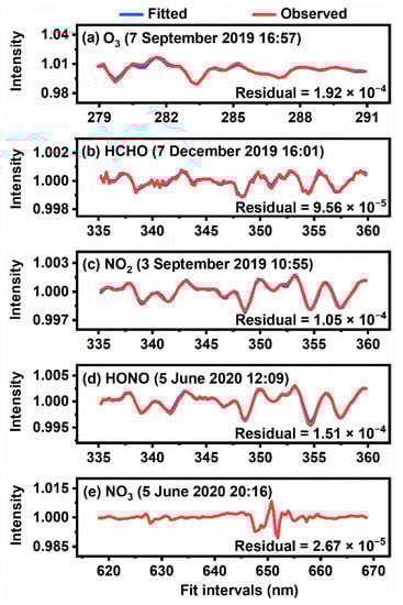 Examples of typical DOAS spectral fitting results for O3 (a), HCHO (b), NO2 (c), HONO (d), and NO3 (e) including the observed and fitted result.
