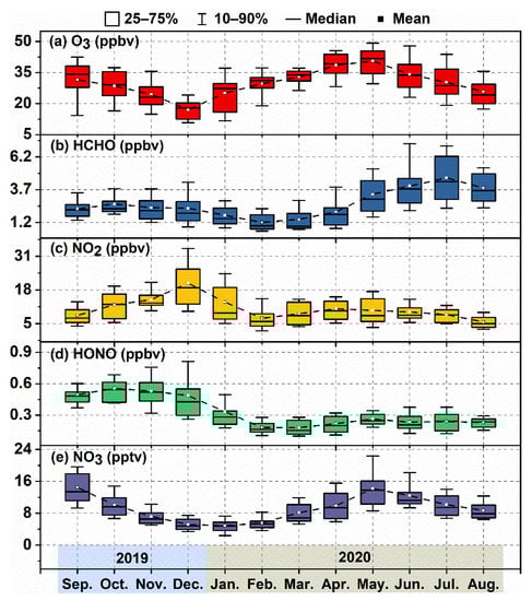 The monthly box charts of the daily means for O3, HCHO, NO2, HONO and NO3 measured by LP-DOAS from September 2019 to August 2020 are shown in Figure 3. The annual means of O3, HCHO, NO2, HONO, and NO3 were 34.33 ppbv, 2.41 ppbv, 12.77 ppbv, 0.61 ppbv and 9.34 pptv, respectively. Overall, the trend of monthly O3 averages presented a single peak during the year with a maximum of 40.56 ppbv and a minimum value of 17.00 ppbv in May 2020 and December 2019, respectively. This was a prominent reduction compared with 2014 to 2018 [], indicating the remarkable delayed benefits of the continuous Clean Air Action Plan in China. It has been reported that O3 concentrations increased sharply in megacities with the implementation of the Clean Air Action Plan in 2013, but decreased after about three or four years later [,,]. In addition, the Meiyu period in June and July of 2020 caused lower surface O3 concentrations, so it was not surprising that the O3 peaked in May 2020. Nevertheless, many higher O3 pollution episodes still occurred in summer even though the means were reduced, as displayed by the short lines of the 90th percentile in the box chart (Figure 3a).