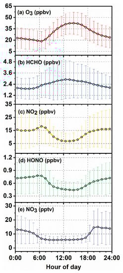 The mean diurnal variations in O3 (a), HCHO (b), NO2 (c), HONO (d), and NO3 (e) from September 2019 to August 2020 in Nanhui, Shanghai. (The error bars indicate the standard deviations).