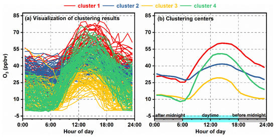Admittedly, averaging over a time scale is a vital and traditional means to assess the temporal characteristics of pollutants. However, as discussed above, higher O3 levels at this observation site were found not only in summer, but also in spring and autumn. Seasonal categories could not integrally reflect the features of higher O3 conditions. In response, we aimed to discard the time limit and classify the O3 pollution based only on the characteristics of the daily O3 variation. Accordingly, K-means clustering methodology was used to identify groups of O3 pollution according to diurnal patterns, which enabled data objects to be assigned to the same cluster in accordance with common features []. Simultaneously, each cluster maintained distinct characteristics. Clustering analysis has been applied in atmospheric pollution for many years, especially using backward trajectory clustering [].