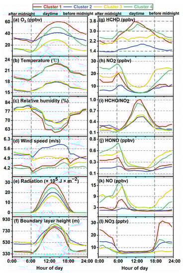 As shown in Figure 6a, the period after midnight produced an O3 gap of about 20 ppbv between clusters 1 and 2 and clusters 3 and 4. There was almost no O3 generation chemically at night, during which the response of the meteorological factors to the O3 concentration between clusters 1 and 2 and clusters 3 and 4 was indistinct, as shown in Figure 6. Therefore, the gap was considered to be the outcome of a depletion effect on the process of nocturnal atmospheric chemistry. Clusters 3 and 4 retained higher NO levels compared to clusters 1 and 2, as denoted in Figure 6e. Ambient NO reacted violently with O3 and was capable of accelerating the O3 consumption []. Therefore, NO was regarded as the driver of the O3 gap in this period.