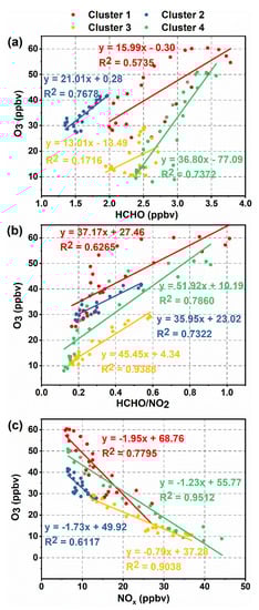 The O3 concentrations and corresponding HCHO concentrations (a), HCHO/NO2 ratios (b), and NOx concentrations (c) for the four clusters. Colored lines represent the linear fit for each cluster.