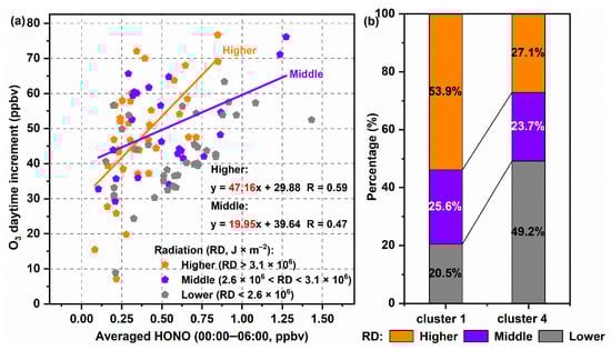 The radiation for cluster 4 was found to be lower than that for cluster 1 during the daytime (Figure 6e); meanwhile, the O3 increase in cluster 4 was larger than that in cluster 1. We accordingly explored the influence of the radiation on HONO-O3 levels, as illustrated in Figure 8. When the radiation was higher, the daytime O3 increment showed the most sensitive reaction to the variation in averaged HONO after midnight, with a slope of 47.16. As radiation dropped to the middle level, the sensitivity was hence reduced, whereas the response between the O3 increment and the averaged HONO was unclear when radiation was lower than 2.6 × 106 J·m−2. Figure 8b shows the proportions of radiation levels in clusters 1 and 4. It is obvious that cluster 1 was more occupied by higher radiation while lower radiation mainly covered cluster 4. Consequently, for cluster 4, it was not surprising to find the larger O3 increment even though the radiation was relatively low.