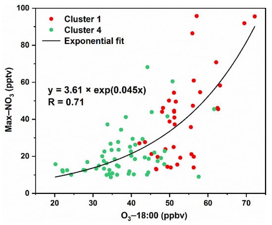 Moreover, the relationship between the daily O3 concentration at 18:00 and the maximum NO3 before midnight was investigated (Figure 9). The O3 level at 18:00 was considered the endpoint of generation and loss during the daytime. Overall, max-NO3 exhibited an exponential growth with O3-18:00, suggesting that the increase tended to be faster gradually. Cluster 1 evidently experienced a steeper rise than cluster 4 owing to the larger persistent level of O3 in the daytime.