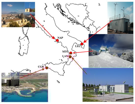A map of the observation sites: NAP (Naples, urban); LEC (Lecce, urban background); LAM (Lamezia Terme, industrial); CGR (Capo Granitola, marine); MTC (Monte Curcio, remote).