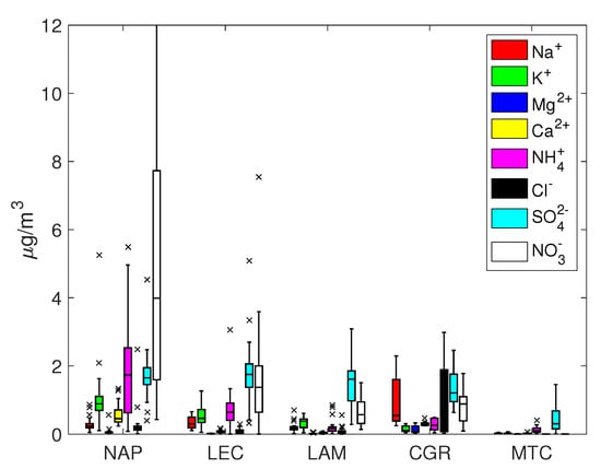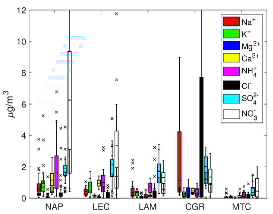 The ion concentrations are reported in Figure 2 and Figure 3 as box and whisker plots. Furthermore, in the supplementary information, the main statistics are reported together with other parameters derived from the ion balance, for example, sea salt concentration, the quantity of the ions derived from sea salt and the charge balance. PM concentrations showed levels comparable to other Mediterranean environments and remote sites [32,33,34,35,36,37,38]. Not surprisingly, PM was high at the NAP urban site (average 52.6 ± 22.2 g/m) and, to a lesser extent, at the LEC site (33.2 ± 12.9 g/m). Significantly lower concentrations were measured for the other sites, especially at the mountain site of MTC. These results lay at the lowest end of the range of data distribution for other Mediterranean and European continental remote sites at a similar altitude [39,40,41,42,43].