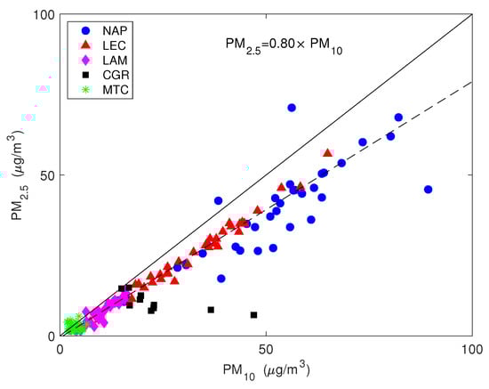 All sites are located in southern Italy, at the center of the Mediterranean area, and are representative of very different environmental conditions: from urban (Naples) to remote sites (Monte Curcio), passing through urban background (Lecce), industrial (Lamezia Terme) and marine (Capo Granitola) sites. Despite the environmental heterogeneity in the dataset, the PM and PM samples showed well correlated mass concentration values with a correlation coefficient of . The overall PM–PM ratio (0.80) was fairly constant across sites, but the PM mass and composition reflected the contribution of different sources. The mean mass concentration of PM ranged from 3.6 g/m at Mt. Curcio, a remote high-altitude site, to g/m at Capo Granitola, a low-altitude coastal site facing the Strait of Sicily, and to more than g/m at Naples, a highly urbanized and densely populated area. A large fraction of the mass of the PM belonged to the fine fraction; the lowest percentage was 50% at the Capo Granitola site, but reached percentages of up to 75% in the urban area of Naples.