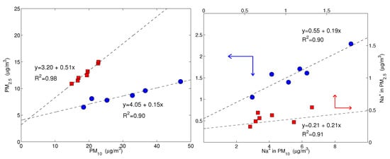 On the (left), the PM concentration is plotted against PM; on the (right), the sodium concentration in PM is plotted against the sodium in PM. Both plots are for Capo Granitola only. The blue dots and red squares represent the samples of two distinct periods: from 25 November to 1 December and from 3 December to 9 December, respectively. Note that for sodium, there are two scales; the red axes, corresponding to the red squares, refer to the upper-right frame and the blue axes, corresponding to the blue dots, refer to the lower-left frame, as indicated by the arrows. The dashed lines are the robust fits for each set of data. The coefficient values are significantly different from zero at p-values of lower than 0.01.
