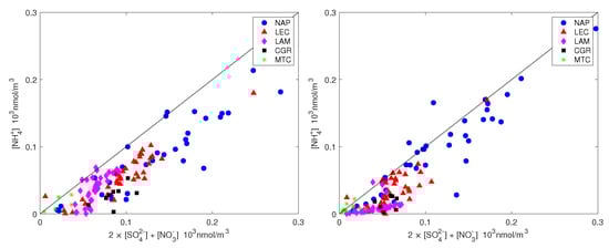 The average atmospheric concentration of CO, calculated from the anion deficit, was 24 nmol/m in PM, which accounted for about 1.5 g/m (averaged over all sites), and was negligible in PM. Similar results have also been obtained worldwide [32,70,71]. Therefore, the most likely explanation for the anion deficit is that a certain amount of CO and HCO existed in the coarse fraction. The differences in the content of carbonate species between the sites did not seem significant. Apart from the NAP site, charges in PM were well balanced regardless of unaccounted species, suggesting that carbonates were mainly contained in the coarse fraction. A slight excess of positive charges seemed to contaminate the fine fraction as well.