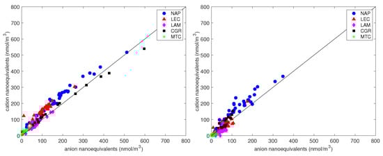 The charge balance between anions and cation equivalents for PM (left panel) and PM (right panel). The straight line is the 1:1 line.