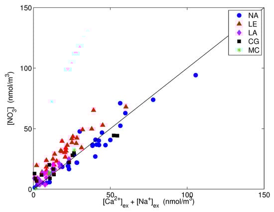 Finally, nitrate is presented vs. the excess sodium plus calcium in the coarse fraction, i.e., their content in PM, in Figure 10. The significant correlation that was obtained confirms that the amount of coarse NO that was not neutralized by sodium was associated with excess calcium.