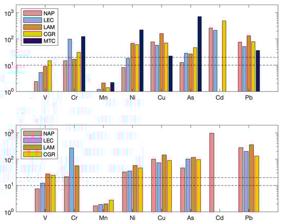 The enrichment factors of the two fractions, PM (top) and PM (bottom), for each site. The two black dashed lines correspond to the two thresholds: EF = 10 and EF = 20.