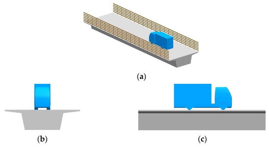 Geometric model of the truck on the bridge ((a) Axonometric view of bridge; (b) front view of the bridge; (c) side view of the bridge).