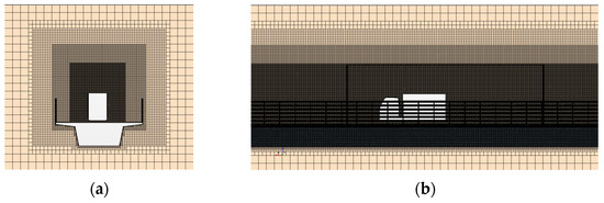 For the setting of the model, the background region is encrypted with multilayer volume grids, and the wind barrier and the car body surface are set as multilayer grids with boundary layers to accurately capture the flow pattern distribution of the wind barrier and the car body surface. Fifteen layers of elements are generated from the truck’s surface, and the initial height is 0.1 mm, with a growth rate of 1.1, keeping the y+ value within an acceptable value in this study. The grid size of the background region is 512 mm, and the grid size of the overset region is 64 mm. The background region is provided with three layers of encryption area, the size of the first layer of encryption area is 256 mm, the size of the second layer of encryption area is 128 mm, and the size of the third layer of encryption area is 64 mm. The overall grid of the calculation domain for bare bridge case is about 30 million and that for wind barrier case is 45 million. It is proven that the calculation results are independent of the number of grids by setting different grid sizes. The calculation model of driving is shown in Figure 4.