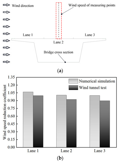 Wind speed reduction coefficient (r) comparison for the bare bridge condition ((a) Measuring points and lane layout; (b) wind speed reduction coefficient of the bare bridge for different lanes).