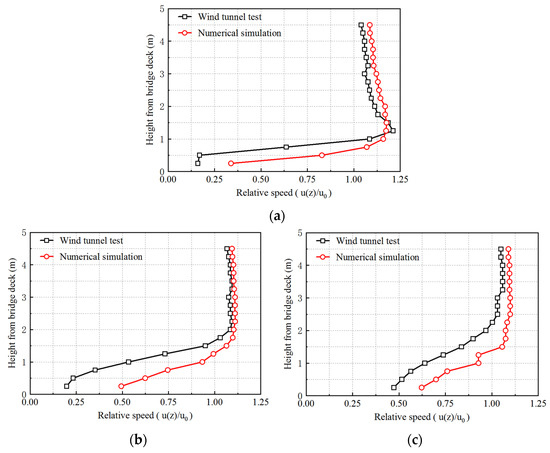 Comparison of relative wind speed values (u(z)/u0) for bare bridge conditions (a) Lane 1; (b) Lane 2; (c) Lane 3.