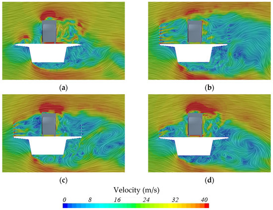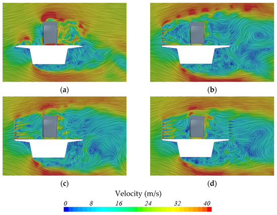 Velocity distribution for different height schemes ((a) Bare bridge; (b) Scheme 2-1; (c) Scheme 2-2; (d) Scheme 2-3).