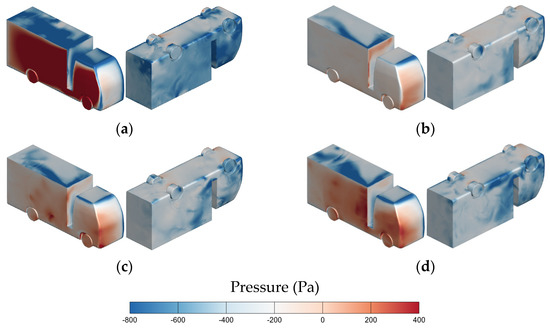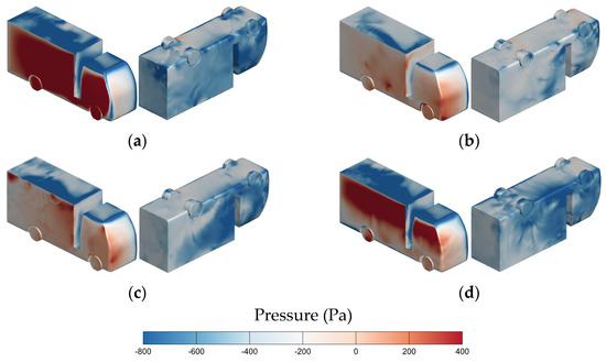 From Figure 9 and Figure 10, it is apparent that the changes in the porosity and size of the wind barrier have a significant impact on the pressure distribution on the surface of the truck body. When the height of the wind barrier is constant, the increases in porosity will lead to an increase in the maximum positive pressure value and the positive pressure area on the windward side of the truck. The change in the wind speed near the ground causes the pressure distribution at the bottom of the truck to be slightly different. However, there is a significant difference in the negative pressure on the top of the truck, in which the negative absolute value and negative pressure area of the top of the truck in Scheme 3 are significantly larger. When the wind barrier porosity is constant, the reduction in the wind barrier height causes the maximum positive pressure value and the positive pressure area of the truck facing the crosswind to increase. The change in height predominantly affects the pressure distribution on the leeward side. It is apparent that the absolute negative pressure value and negative pressure area of the truck bottom and the leeward side increase with decreasing height.