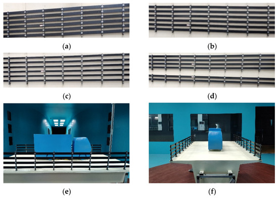 Wind barrier and wind tunnel test ((a) Scheme 1; (b) Scheme 2-1; (c) Scheme 3; (d) Scheme 2-2 and Scheme 2-3); (e) side view the of wind tunnel test; (f) front view of the wind tunnel test.