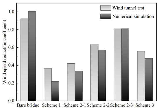 As shown in Figure 13 and Figure 14, there are significant differences in the wind speed of bridge decks with different barrier parameters, and the results obtained by the two methods in each lane are relatively similar. The wind speed reduction coefficient is reduced upon the installation of a wind barrier, and it increases with decreasing height and increasing porosity. When the height of the wind barrier is 3 m and the porosity is 50%, the wind speed within the height of 4.5 m of bridge deck is less than the wind speed of the incoming flow which can carry out effective protection for all over cars on the bridge. The wind speed profiles on the driving lanes of vans under different wind barrier schemes are shown in Figure 15. Height is a critical parameter for the strip-type barrier that affects the wind resistance performance. For a bare bridge, the wind speed of the bridge deck increases with the increasing ground clearance, and the wind speed below a bridge deck height of 16 cm is lower than the incoming wind speed. Due to the influence of turbulence on a bridge, the wind speed in the area above a bridge deck height of 16 cm is higher than the incoming wind speed and reaches the maximum when the distance from the bridge deck is 20 cm. Under wind barrier conditions of different heights, the wind speeds corresponding to the bridge deck area above the height of the strip-type barriers are lower than those of the bare bridge. The wind resistance performance can be improved as the height of the barrier strips increases. The greater the height of the barrier strips, the greater the effective shielding height. However, there is no obvious pattern in the area below the height of the barrier. There are airflow acceleration areas within the height range of 10 cm near the ground, such as the heights of 20 cm and 30 cm. The wind speed near the ground is significantly higher than that of the bare bridge, which will result in the lower part of the van wind pressure increasing, which can affect driving safety.