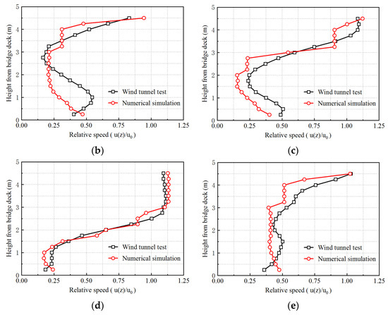 Comparison of relative wind speed values (u(z)/u0) for different wind barriers in Lane 2 ((a) Scheme 1; (b) Scheme 2-1; (c) Scheme 2-2; (d) Scheme 2-3; (e) Scheme 3).