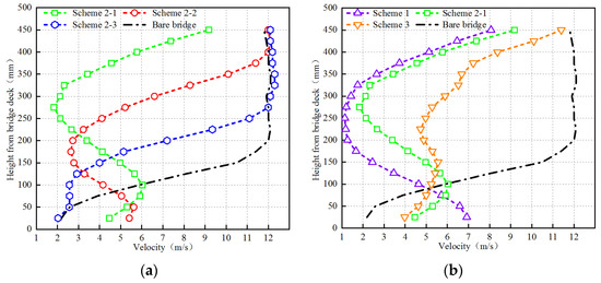 Effect of wind barrier on wind speed of a bridge deck ((a) Different height scheme; (b) Different porosity scheme).