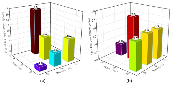 According to the speed test, the strip-type wind barrier has a significant effect on reducing the wind speed of the bridge in a specific height range, but it will induce an airflow acceleration zone near the ground. To evaluate the wind resistance effect of the strip-type wind barrier more objectively, the force measurement tests of the van under the different barrier schemes are carried out. The conditions of aerodynamic side force and lift force under different heights and porosities of the wind barrier are shown in Figure 16. The aerodynamic side force has significant regular changes with porosity and height, but the aerodynamic lift shows irregular changes. The reason for this situation is that the aerodynamic lift is more sensitive to the near-ground wind speed. However, the irregular changes in the near-ground wind speed of the bridge under different wind barrier schemes lead to irregular changes in aerodynamic lift, which is consistent with the numerical simulation results. Consequently, when the porosity is deterministic, the aerodynamic side force increases as the height of the barrier decreases. At a certain height, the aerodynamic side force increases with increasing porosity. The change in barrier height has a greater effect on the aerodynamic lift, mainly due to its influence on the wind speed near the ground on the windward side of the truck, while the change in porosity has a smaller effect on the aerodynamic lift.