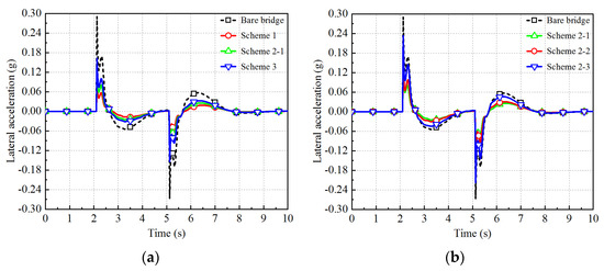 Figure 18 shows the lateral acceleration response curves for different operating conditions. The lateral wind acts in the second second and disappears in the fifth second, with a continuous action time of 3 s. At the moment of disappearance of crosswind action, the lateral acceleration has sudden changes. It increases with the wind barrier porosity and decreases as the wind barrier height increases. During the change of porosity from 40% to 60%, the peak lateral acceleration response increases from 0.084 g to 0.162 g, the value of the three porosity schemes is reduced by 70.9%, 56.4%, and 43.9% respectively, compared to the bare bridge condition (0.289 g). The peak lateral acceleration response increased from 0.126 g to 0.233 g during the height reduction from 3 m to 1 m. The values of the three height schemes are reduced by 56.4%, 46.1%, and 19.4%, respectively, compared to the bare bridge condition (0.289 g).