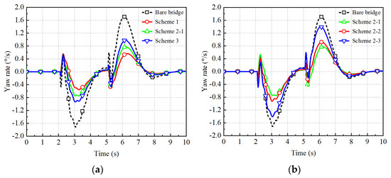 Yaw rate with different bridge wind barriers ((a) Different porosity scheme; (b) Different height scheme).
