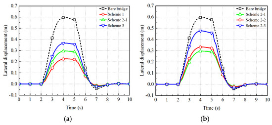 Lateral displacement with different bridge wind barriers ((a) Different porosity scheme; (b) Different height scheme).