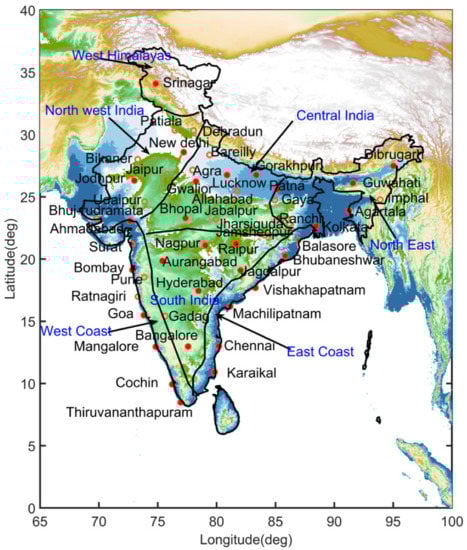 This study analyzed the daily averaged RH data from 49 surface meteorological stations (both filled and empty red circles) across India obtained from the National Climate Data Center (https://www.ncdc.noaa.gov/cdo-web/datasets (accessed on 4 November 2021)). The geographical locations of different stations and regions along with seasonal and annual precipitation and temperature are shown in Figure 1 and Table 1. We have considered data according to consistent length and relatively uniform distribution from January 1980 to December 2020. Visual inspections show that data are uniformly distributed over India except the western Himalayan region. The RH data were checked with strict quality control with these three inspections, i.e., reliability, consistency, and representativeness, and all factors showed good integrity.