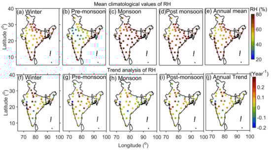 The climatological mean values of RH for each station during different seasons and annually are represented in Figure 2. Over the Indian subcontinent, the variability of surface RH varies from station to station and seasonally. The East and West Coast stations have higher RH values in all seasons, followed by the Northeast and low values in the North-west. Except for South and Northwest India, all stations have high humidity levels during the winter, while all regions, with the exception of Coastal and Northeast India, have low humidity levels before the monsoon (Figure 2a,b). Large RH values are observed during the monsoon and post-monsoon seasons, with the exception of a few stations in Northwest India. Moisture transport from the ocean causes high RH values. During the monsoon and post-monsoon seasons, moisture is transported from oceanic regions to the land surface, resulting in high RH values []. The surface RH is highest during the monsoon, lowest during the post-monsoon, and lowest during the pre-monsoon and winter. When compared to other seasons, the distribution of RH over the Indian subcontinent is highly variable during the pre-monsoon season. During the winter, higher RH values are caused by the trapping of water vapor in the boundary layer, whereas low RH values are caused by the higher surface temperature prior to the monsoon. Except for winter, coastal stations remain the most humid region. Following the findings of the current study, Jaswal and Koppar [] discovered higher annual mean RH along the Indian coastline in North and Northeast India during the monsoon season.