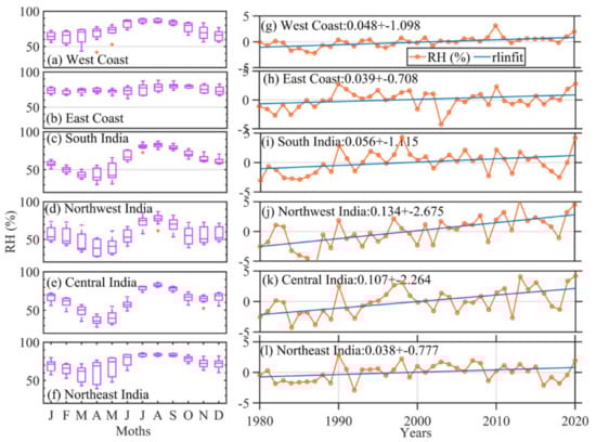 Box-whisker plots show composite monthly mean relative humidity over different regions in India (a) West coast (b) East coast (c) South India (d) Northwest India (e) Central India (f) Northeast India. (g–l) represents region-wise averaged RH annual time series from 1980 to 2020. The blue line depicts the robust regression analysis performed at a 95% confidence interval to obtain the trend.