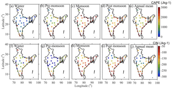 - The highest values of Convective Available Potential Energy (CAPE) are observed over the West and East Coasts during pre-monsoon, monsoon, and post-monsoon seasons. Very low values are noticed during winter in the maximum number of stations. A completely opposite pattern is observed in Convective Inhibition (CIN) compared to CAPE variability, which is expected. The highest values of CAPE correspond to the lowest values of CIN and vice versa.