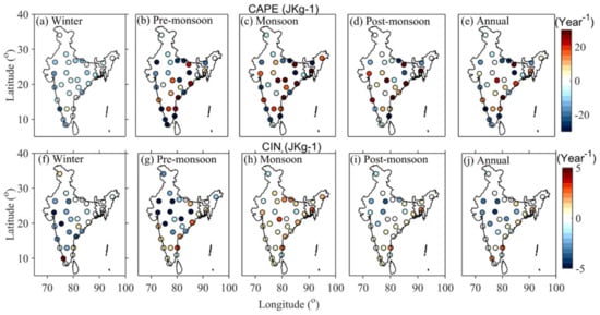 To understand the spatiotemporal variability of CAPE and CIN all over India, the seasonal and annual climatological variability is shown in Figure 4. The coastal stations have shown very high values of CAPE (3000 J·kg−1) in all seasons except winter. During winter, very low values of CAPE have been noted all over the inland stations due to a lack of moisture (Figure 4a). Very large values of CAPE are observed during the monsoon sea-son in most of the stations compared to other seasons (Figure 4c). Higher values of CAPE and lower values of CIN and vice versa are clearly evident in all seasons (Figure 4). The highest values of CAPE appear in coastal regions due to the availability of moisture. The seasonal values of CAPE depend upon the surface temperature and moisture content. CAPE seasonal values are affected by surface temperature and moisture content. The monsoon season has the highest CAPE values, followed by the post-monsoon, pre-monsoon, and winter seasons. Figure 5 depicts the CAPE and CIN trend values at a 95 percent confidence level.