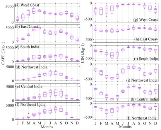 - Region-wise viability of CAPE follows a similar pattern to RH. In West and East Coast stations, CAPE increases from January and attains a peak value during the month of May and decreases later, again reaching a maximum in September and decreasing thereafter. In these regions, during pre-monsoon season, instability conditions occur during severe land surface heating. In other regions, the increase in CAPE observed from January reaches a peak in August and decreases thereafter.