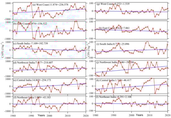 Time series of annual mean CAPE over different regions in India from 1980–2020. (a) West Coast, (b) East Coast, (c) South India, (d) Northwest India, (e) Central India, and (f) Northeast India. (g–l) is the same as (a–f) but for CIN. The blue line depicts robust regression analysis performed at a 95% confidence interval to obtain the trend.