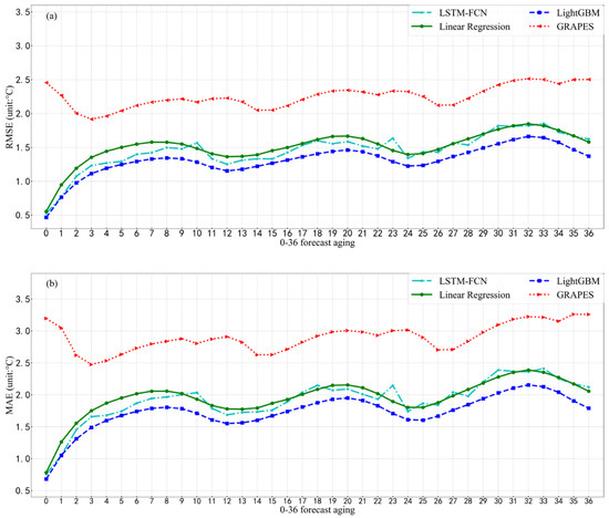 In the distribution of the RMSE and MAE from 0 to 36 h forecast timelines (Figure 5), the correction results of Linear Regression, LSTM-FCN and LightGBM are affected by the GRAPES-3km model output. The RMSE and MAE were basically consistent with the change trend of GRAPES-3km model except for the initial 3 h, showing a trend of alternating troughs and crests, and the overall trend of prolonged forecasting effect with time effect is decreasing.