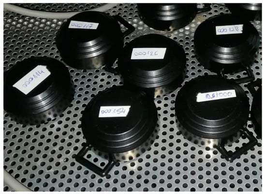 A radon decaying reference atmosphere was produced recently (26 November 2021–2 December 2021) in the radon chamber from IFIN-HH/LMRI, in a similar method as described above in Section 3.1. The radon was kept in the radon chamber for about 6 days (147 h), in order to perform a controlled integrated exposure of several solid-state nuclear track detectors (TASTRAK and RADOSYS types). Only the results obtained with the TASTRAK detectors are reported in this work. The experimental arrangement of the TASTRAK detectors in different regions inside the radon chamber is presented in Figure 8 (two other detectors were placed outside the radon chamber for the radon background monitoring).