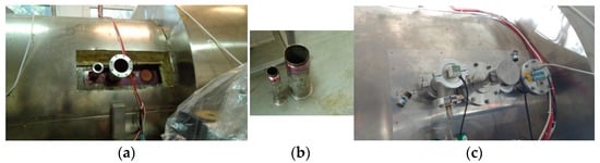 The tightness improvement of the radon chamber (the four lateral pipes processing): (a) cutting the external enclosure of the radon chamber and extraction of the lateral pipes; (b) two lateral pipes dismantled; (c) the final setup of the lateral pipes (after improvement).