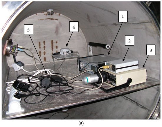 (a) Experimental setup in the radon chamber for the calibration of the Pylon AB5 monitor: 1—the AlphaGuard DF2000 monitor; 2—the Radon Scout monitor; 3—the Pylon monitor; 4—humidity sensor; 5—fan. (b) Diagram of the radon chamber, its accessories and the connections used for monitor calibrations: 1—the AlphaGuard DF2000 monitor; 2—the Radon Scout monitor; 3—the customer monitor; 4 and 5—temperature and humidity sensors, respectively; 6—radon activity-decaying source in a closed steel recipient; 7—computer with specific software; 8—air pressure sensor; 9—vacuum pump; 10—two fans used for the uniformity of the radon distribution.