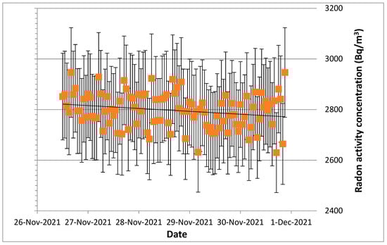 Following this experimental result, the tightness of the radon chamber was significantly improved, by performing the technical work described above in Section 2.4. This improvement was experimentally confirmed during the period 26 November–1 December 2021 (about 4.5 days), by performing radon activity concentration measurements with the AlphaGuard DF2000 monitor placed in a reference radon atmosphere (in the same radon chamber). This time, the experimental data trend was much better: from an initial value of 2820 Bq/m3 the activity concentration went down to 2770 Bq/m3 (reference date and time for all these measurements: 26 November 2021, 12:00 h (UTC + 2)), which estimates a radon relative loss of only about 1.8% in 4.5 days (see Figure 7). This means that, after the technical improvements, the radon loss from the closed radon chamber was reduced about 20 times.